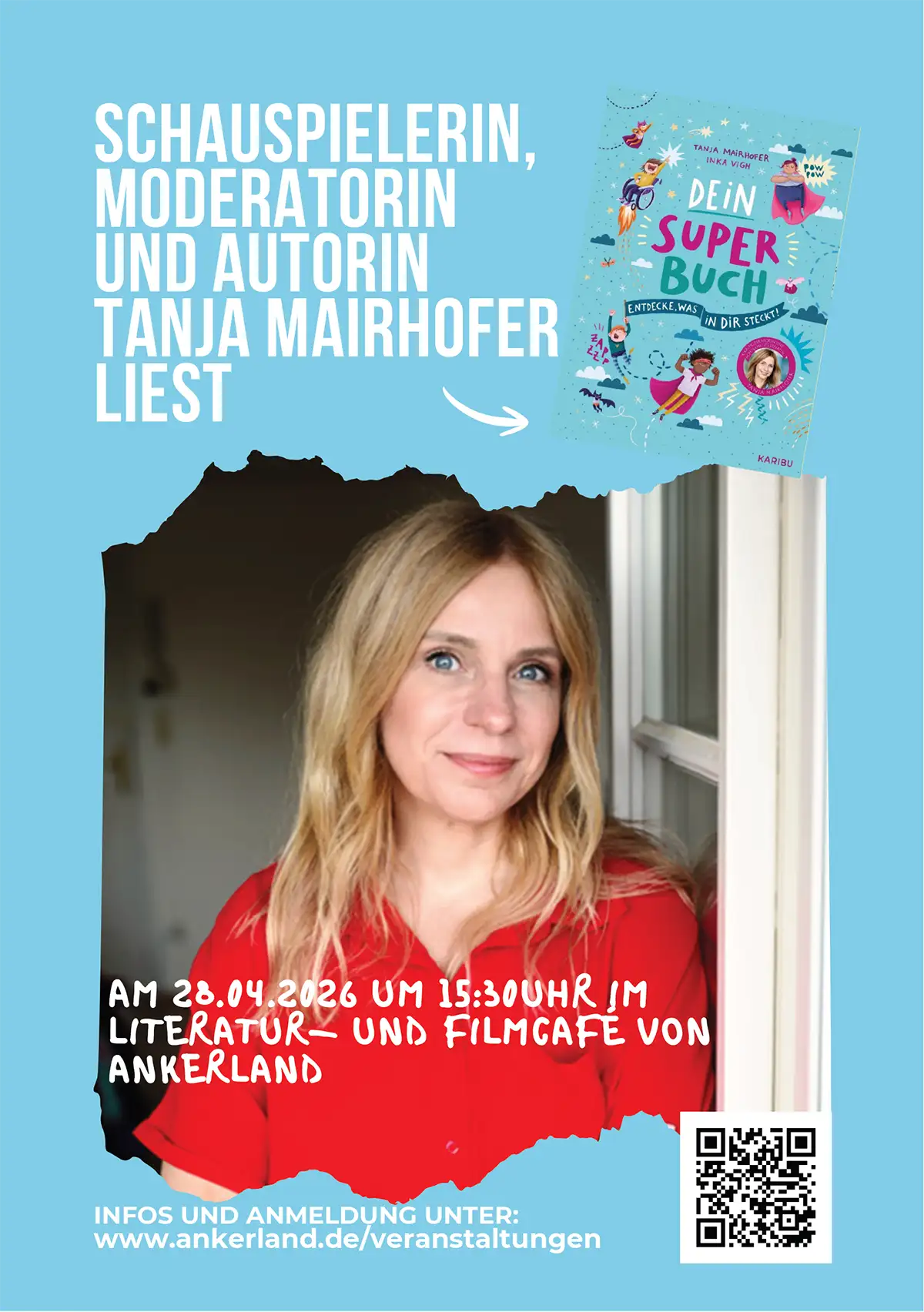 Unsere Botschafterin Tanja Mairhofer zu Gast bei Ankerland. Am Dienstag, den 28. April 2026, um 15:30 Uhr, liest unsere Botschafterin Tanja Mairhofer aus ihrem Buch „Dein Super-Buch“.